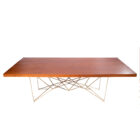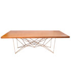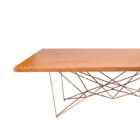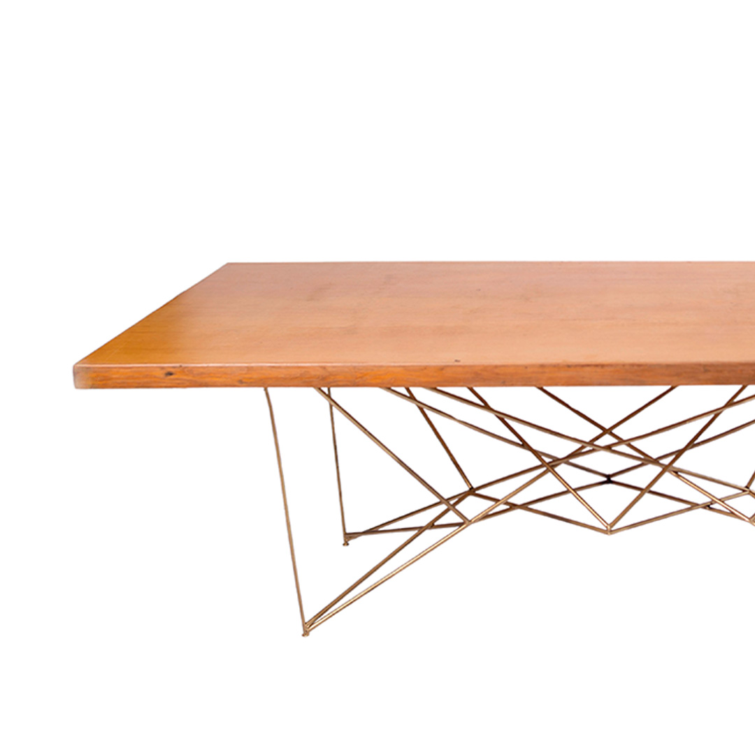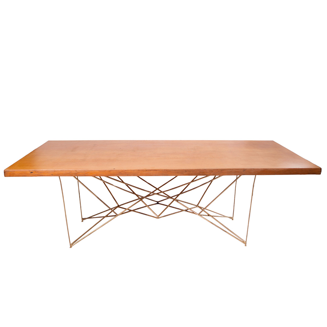 Mesa de madera rectangular con base de herrería geométrica. Capacidad para 10-12 personas.
